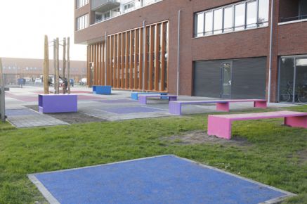 Het was een uitdrukkelijke wens van de school om het plein op te delen in aparte zones: de kinderen hebben een houvast nodig, zoals een visuele of fysieke grens. Op het plein liggen daarom verschillende kleurvakken, die een hulpmiddel vormen om eenvoudiger door de ruimte te bewegen of juist binnen een 'kader' te blijven. De verschillende zones zijn bovendien omsloten door hagen, die verschillende 'kruip-door sluip-door'-routes mogelijk maken. Zo worden op een speelse wijze kaders geschapen, waardoor een buitenruimte ontstaat die een geborgen en veilig gevoel geeft en tegelijkertijd voldoende stimulans en uitdaging biedt aan de kinderen.